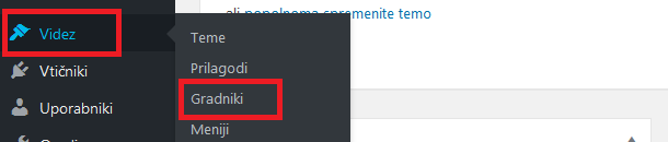 1. korak: V WordPress nadzorni plošči pojdite na menijsko postavko Videz in nato Gradniki.