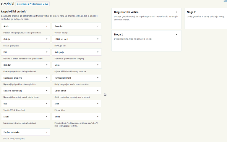 Gradnike lahko dodamo v vnaprej določena območja. Gradnike najpogosteje dodajamo v stransko vrstico (Sidebar) in v nogo (Footer).