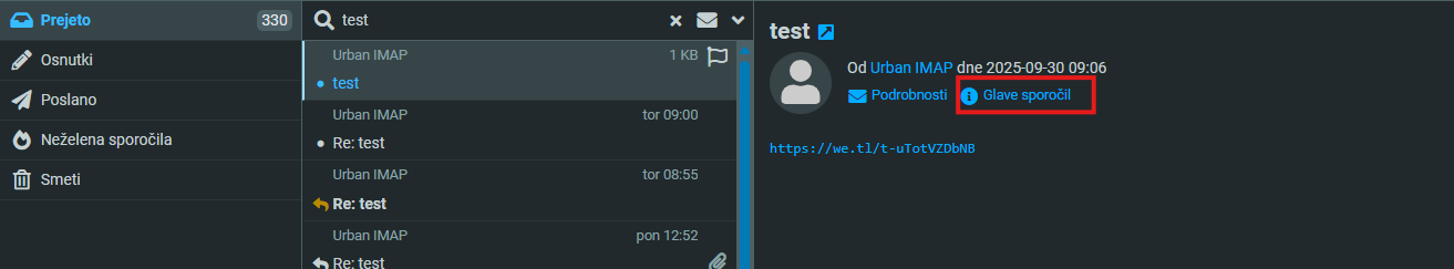 (Preklopi na neobdelan zapis glave sporočila), kjer se vam prikaže neobdelan del glave z izvorno kodo sporočila.