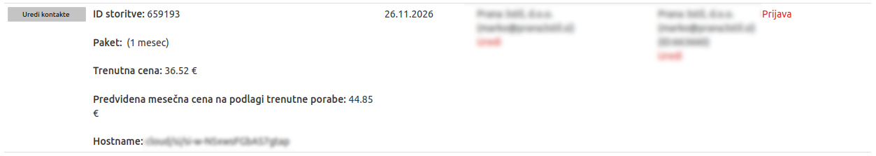 Na seznamu bo prikazan trenutni skupni strošek Domenca Cloud ter predviden mesečni strošek, ob predpostavki, da se ne dodajajo novi strežniki ali spreminjajo obstoječi viri.