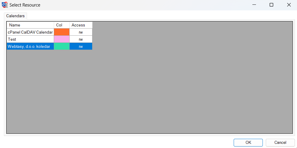 Z miško izberite koledar, ki ste ga kreirali v cPanel nadzorni plošči in kliknite na gumb OK.