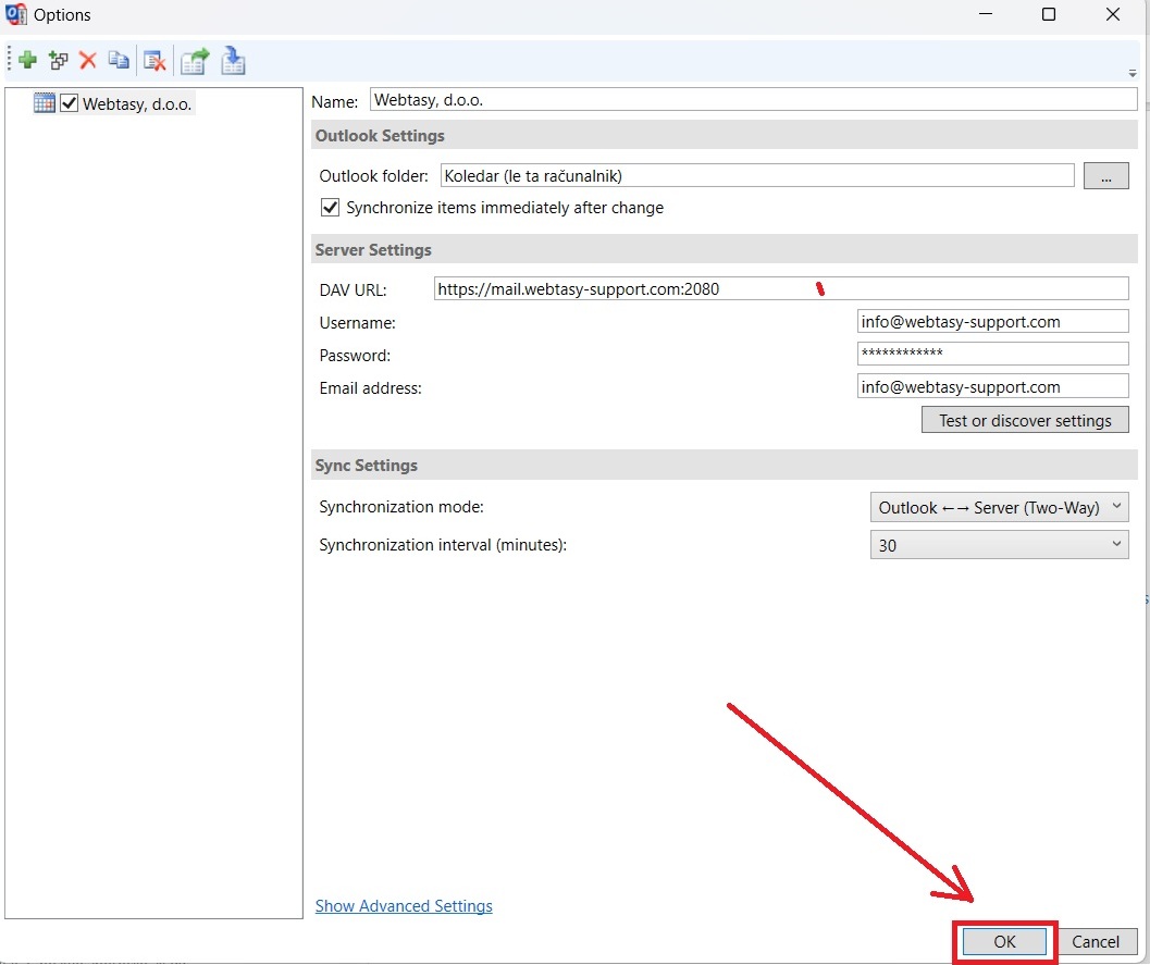 7. KORAK: Če želite preveriti ali sinhronizacjia deluje, priporočamo, da v spletni pošti Roundcube v koledar vnesete dogodek in nato ponovno sinhronizirate koledar v e-poštnem odjemalcu.