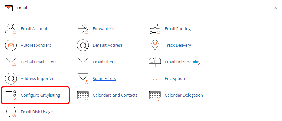 2. V polju EMAIL kliknite na ikono Configure Greylisting.