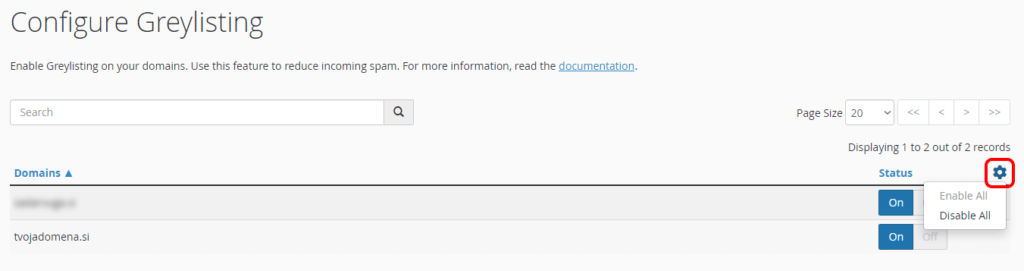 4. V kolikor bi želeli vklopiti ali izklopiti “Greylisting” za vse domene, kliknite na ikono za nastavitve (prikaz na sliko spodaj) ter izberite “Enable All” za vklop na vseh domenah ali “Disable All” za izklop na vseh domenah.