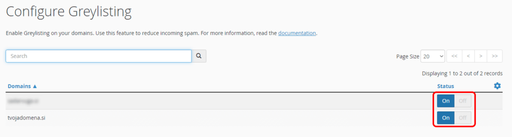 3. Za posamezno domeno lahko vklopite ali izklopite “Greylisting” s klikom na gumb ON/OFF.