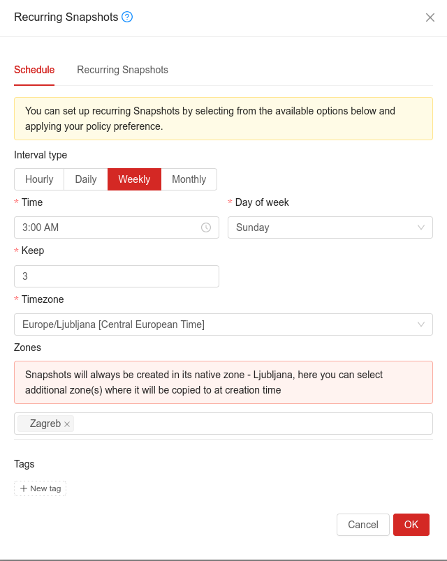 - Keep – določite največje število snapshotov, ki se hranijo za ta interval. Ko je limit dosežen, se najstarejši snapshot samodejno izbriše.