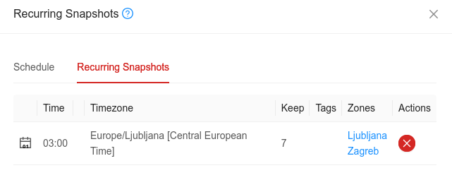 5. V nekaj trenutkih je urnik nastavljen. Če želite preveriti ali izbrisati urnik ponovno kliknite na ikono Recurring Snapshots ter nato na zavihek Recurring Snapshots.