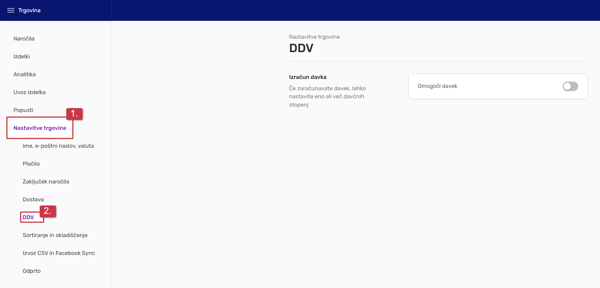 Domenca spletna trgovina, omogoča možnost samodejnega izračuna davkov. Stopnje davkov, lahko nastavite za države, ki ste jih navedli v območjih dostave in sicer za vsako državo posebej. Za dostop, do urejevalnika davkov, v navigacijskem meniju kliknite na Nastavitve trgovine in DDV.