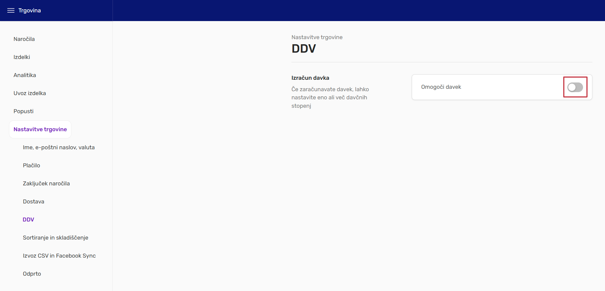 V kolikor želite, da se davek izračuna je potrebno to možnost vključiti. To storite z klikom na drsni izbirnik pri možnosti Omogoči davek.