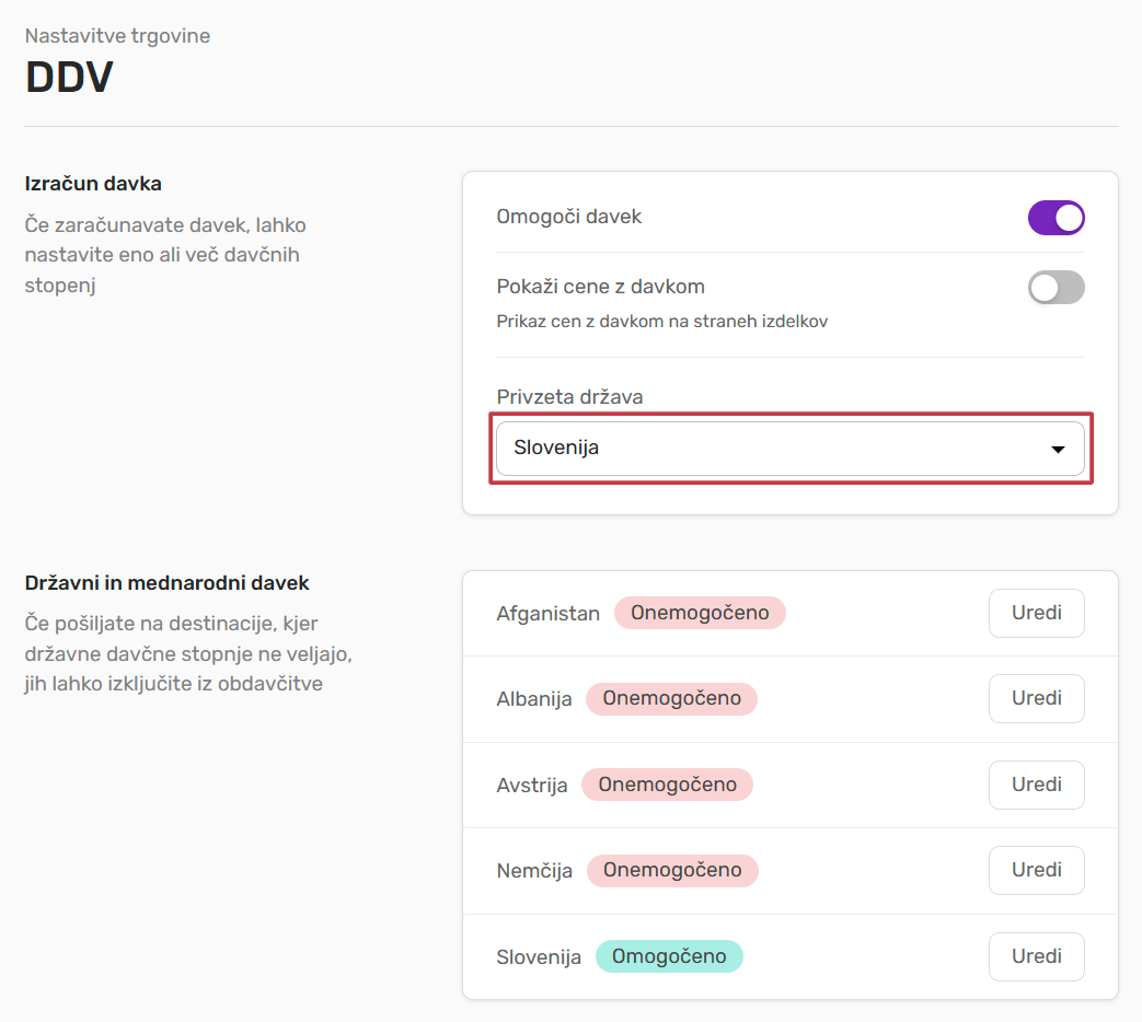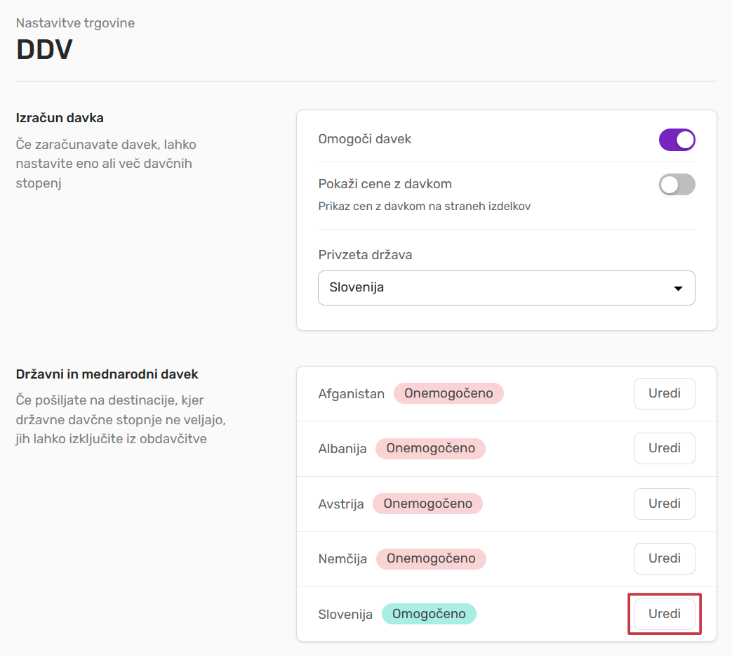 Davčno stopnjo, za posamezno državo lahko uredite z klikom na gumb Uredi desno od naziva države na seznamu držav.