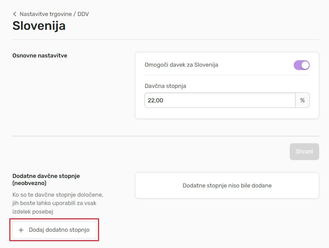 V kolikor bi želeli ustvariti dodatne davčne stopnje, ki jih lahko dodelite posameznim izdelkom, lahko to storite z klikom na gumb Dodaj dodatno stopnjo.