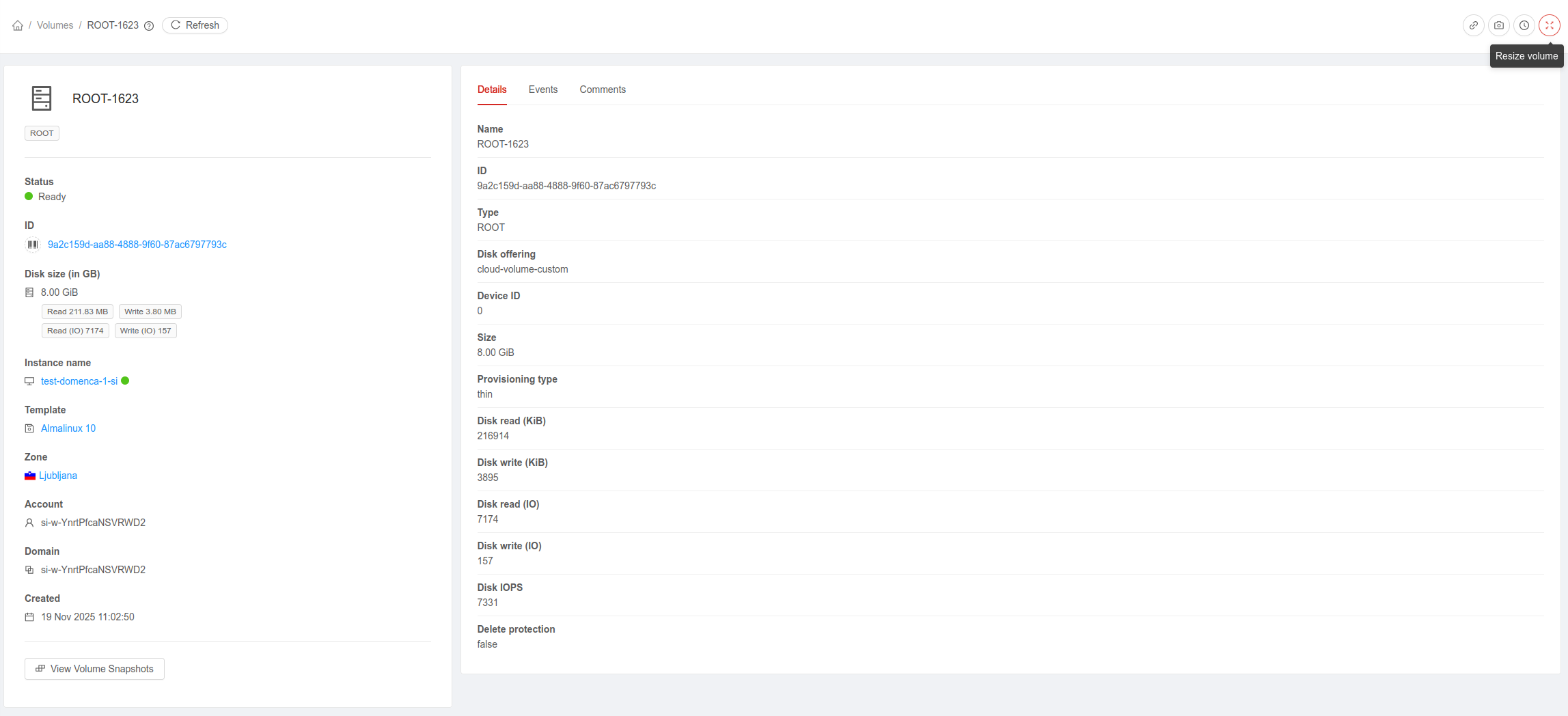 5. Odpre se vam nova stran s podatki o disku. V desnem zgornjem kotu kliknite na ikono Resize volume.