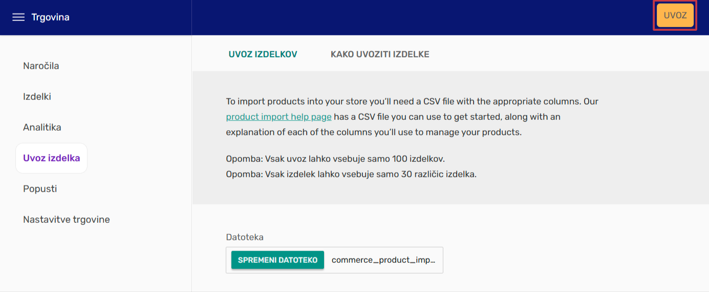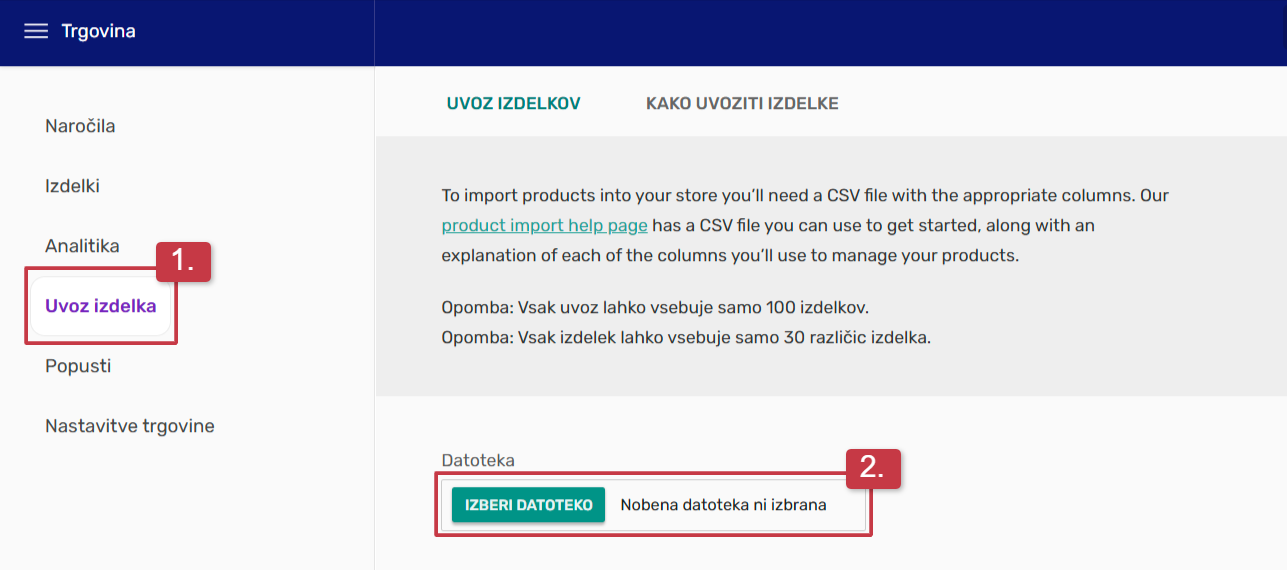 1. Za uvoz izdelkov, odprite podstran Uvoz izdelka. CSV datoteko, lahko izberete z klikom na gumb Izberi datoteko.